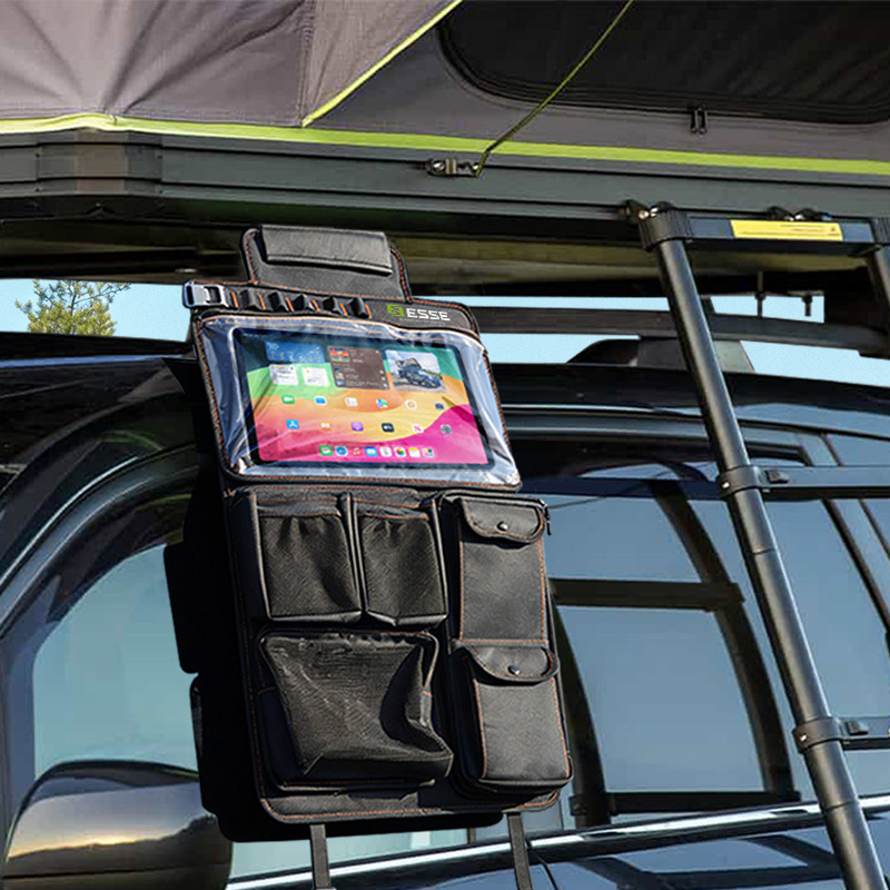 Hangs on your vehicle seat via headrest strap and anchor loops.