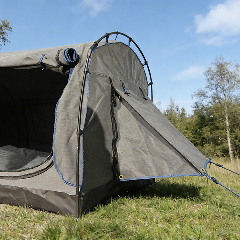 The tent itself is built for the Australian market. Taut top with adjustable centre pole, fine mesh fabric for insect protection and airflow, built-in flysheet with pull cord for rain and snow protection.